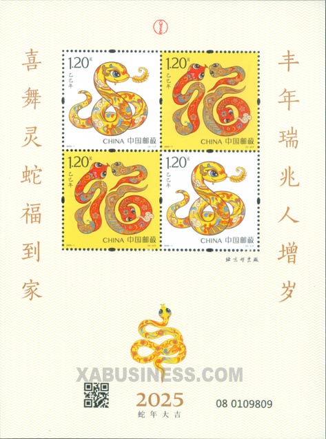 China Post is scheduled to issue a set of 2 special stamps titled "Year of the Yisi (Snake)" on January 5, 2025. Designed by Pan Hu and Zhang Wang, the set draws inspiration from Dunhuang murals and traditional folk customs, skillfully integrating the image of the snake with auspicious connotations. It not only embodies the unique charm of the Chinese zodiac culture but also embodies the simple and flexible folk wisdom.The first stamp, themed "Snake Bringing Bumper Harvests", extracts the vivid imagery of coiled snakes in traditional Chinese culture and adorns it with festive elements to echo the New Year atmosphere. The golden snake winds gracefully, holding a bunch of "auspicious grain" in its mouth, symbolizing the beautiful scene of "abundant granaries and sufficient food and clothing". Its shimmering golden body contrasts beautifully with the bright wheat ears, as if depicting a brilliant and prosperous picture of the harvest season. It implies a year of favorable weather, a bumper harvest of all grains, and a peaceful and prosperous era of national peace and people's security.