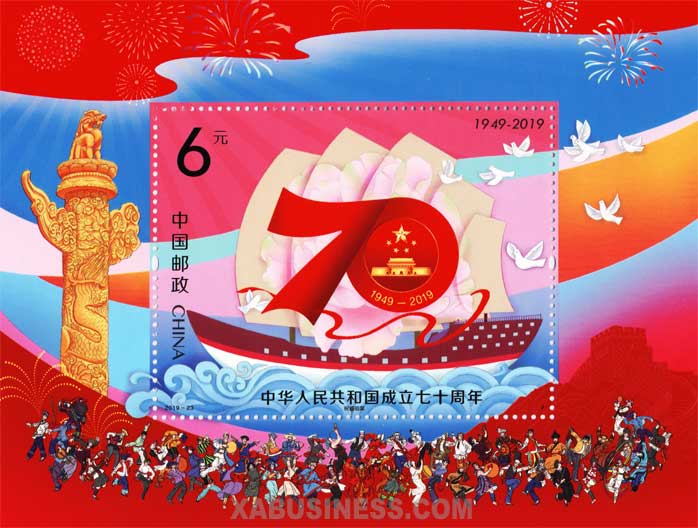 China Post is scheduled to issue a set of 5 commemorative stamps and 1 souvenir sheet themed "The 70th Anniversary of the Founding of the People's Republic of China" on October 1, 2019. The stamps bear the following designs: Sustained and Healthy Economic Development, Advancement of Socialist Democratic Politics, Flourishing Culture, Continuous Improvement of People's Livelihood, and Building a Beautiful China. The souvenir sheet is titled Blessing the Motherland. The total face value of the complete stamp set is 12 yuan.In addition, a prestige booklet with the same theme will be jointly printed and issued with Hongkong Post and Macao Post and Telecommunications Bureau. The booklet contains one souvenir sheet each from China Post, Hongkong Post, and Macao Post and Telecommunications Bureau.