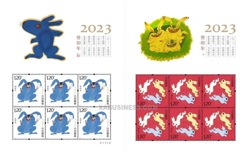 In accordance with the 2023 Special and Commemorative Stamp Issuance Plan, China Post Group Co., Ltd. issued a set of 2 special stamps and 1 stamp booklet themed "Gui Mao Year" (the Year of the Rabbit in the Chinese zodiac) on January 5, 2023. The two stamps are titled "Sending Blessings in Gui Mao Year" and "Coexisting in Unity for a Shared Future", each with a face value of 1.2 yuan. The planned circulation of the two stamps is 39.5 million and 38 million respectively, and that of the stamp booklet is 4.8 million.The "Gui Mao Year" special stamps are the 8th set in the 4th series of China's zodiac stamps. The first stamp, "Sending Blessings in Gui Mao Year", depicts an intelligent Rabbit (the zodiac animal of Gui Mao Year) in childlike blue, holding a brush in its right paw and a letter in its left. It combines the zodiac theme with the culture of letter-writing, reflecting the Chinese people's tradition of caring for each other, expressing nostalgia and sending blessings through letters during the Spring Festival. It also embodies the beautiful aspiration of working together to draw a grand "blueprint" in the new year. The second stamp, "Coexisting in Unity for a Shared Future", shows three rabbits running endlessly with their heads and tails connected. Its design is inspired by the pattern of "Three Rabbits Sharing Ears" from the Dunhuang murals, conveying the auspicious meanings of endless vitality and happy reunion. It symbolizes the Chinese nation's spirit of self-improvement and vitality, the Chinese people's unity in struggle and concerted efforts, as well as the country's strength and the people's vigor. The background is adorned with the decorative pattern of "Jade Rabbit Pounding Herbs" (a classic Chinese mythological image), expressing the beautiful wish of overcoming the epidemic and returning to normal life, and conveying the sincere prayer for national prosperity, people's peace and good health.